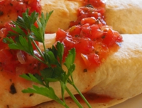 二皿目は「少し量が多いかも」と言われましたが、そのまま出して頂いた「ラップサンド」。トルティーヤ・シートにアボガド、ハム、スクランブルエッグ、ルッコラなどの野菜を挟んで、サルサソースを掛けています。口の中でいろんな味が相まって、これもまた美味。ただ、やはり量が多くて、お腹いっぱいに。