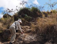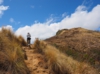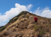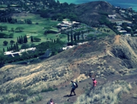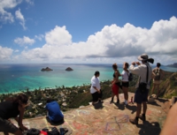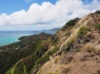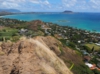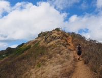 少しなだらかにはなりますが、まわりに岩があったりして、乾燥した草が生えています。右手はゴルフコースが見えるカイルア側、左手にラニカイビーチ、振り返ると、カネオヘが見えるという、写真撮影には絶好な場所ですが、高尾山より厳しい登山道です。