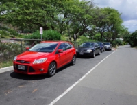 オーナーに教えて頂いた駐車ポイントを探します。隣りはゴルフ場、まわりは住宅地の中です。数台置かれていたエリアですが、なんとか1台スペースが空いていました。ココに置けないと、路駐になっちゃうので、ヤバイですね。