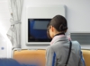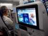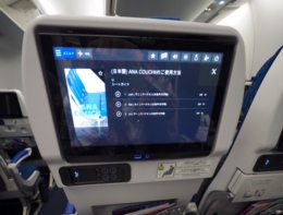 シートの頭部には、左右と上下に調整できるヘッドレストが付いています。これなら空気で膨らむ枕は不要でした。シートの前方には13.3インチ・タッチモニター、モバイルPCサイズですから、結構デカイです。昔は決まった時間の決まった映画しか見れなかったですが(遠い目)、当然好きな映画を好きなタイミングで見れるしくみ。ただ、往路は寝る事に専念します。