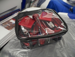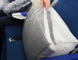 席に行くと、TVで見た、大きな枕とシーツのパッケージが置かれています。後方エリア担当のCAは約4〜5名。どなたも若手ですがキビキビしていて笑顔です(←これだけで満足(爆))。簡単な説明と食事が終わったら、専用のシートベルトも渡してくれるとの事。