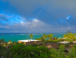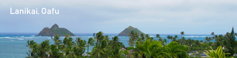 部屋からラナイというかデッキに出ると共用スペース。狭いラナイはウチの部屋専用とのこと(ていうか、外廊下だけどな)。このアコモの最高の売りは、ラニカイのビーチの先にモクレア・アイランズというラニカイビーチを象徴する双子の島が一望できること。ちょっとスコールが降り始めました。荷物をアンパックして雨が止んだら、カイルア・タウンへ買いものに出かけます。