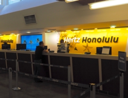 さて、建物の外へ。今回はシャトルバスには乗りません。5年で変わったんですよね。個人出口を出たら、ひたすら右方向へ。柱にレンタカーの案内が出ているので、スーツケースを転がして進みます。通りの反対側に大きな駐車場風の建物が見えたら、入り口に向かって道路を渡ります。建物に入ってすぐ右に入ると、レンタカーオフィスが並ぶエリア。真ん中くらいにHertzのデスクが。