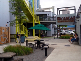 【SALT】というカカオコの真ん中にあるションピングモールですが、ここにお目当てのホットドッグ屋があります。またバレット(駐車場サービス)も貰えます。細長いタワー状の狭い駐車場に入り、ぐるぐる回って、少し上階に。外光が差し込む明るいスペースを選びます。ホントはスーツケースを置いていきたくないのですが、有料駐車場であること、今回のレンタカーはフルサイズで外からスーツケースが見えない事、外から丸見えなスペースとした事から、そのまま駐車してエレベーターで1階へ(不安だけど、ケースをゴロゴロ転がす方が観光客まるだしなので)。