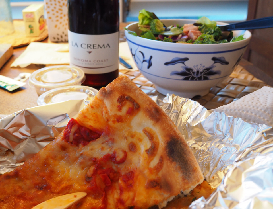 もうココが無いと、カイルアで生活できない体に。晩飯確保です。こちらもオーダーし慣れたサラダバーのコーナー、そしてToGoのピザも確保。ワインは5年前に飲んだ銘柄の小瓶をゲット。
