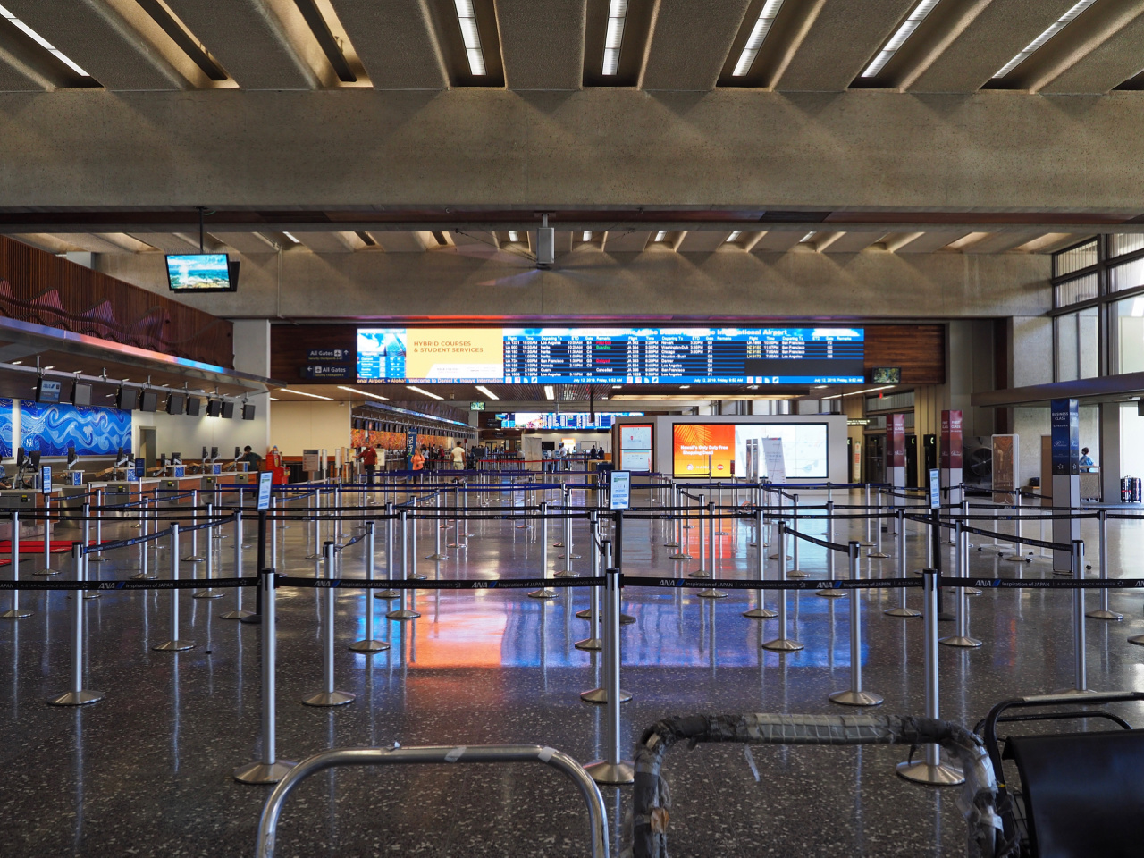 チェックインに向かいます。拍子抜けする位にガラガラ。まあ金曜日ですから、土曜日帰国便の方が混みますよね(^_^;) 荷物を預けて、奥にあるセキュリティに。その先のセキュリティゲートはそれなりに混んでいましたが、無事出国手続きを済ませました。