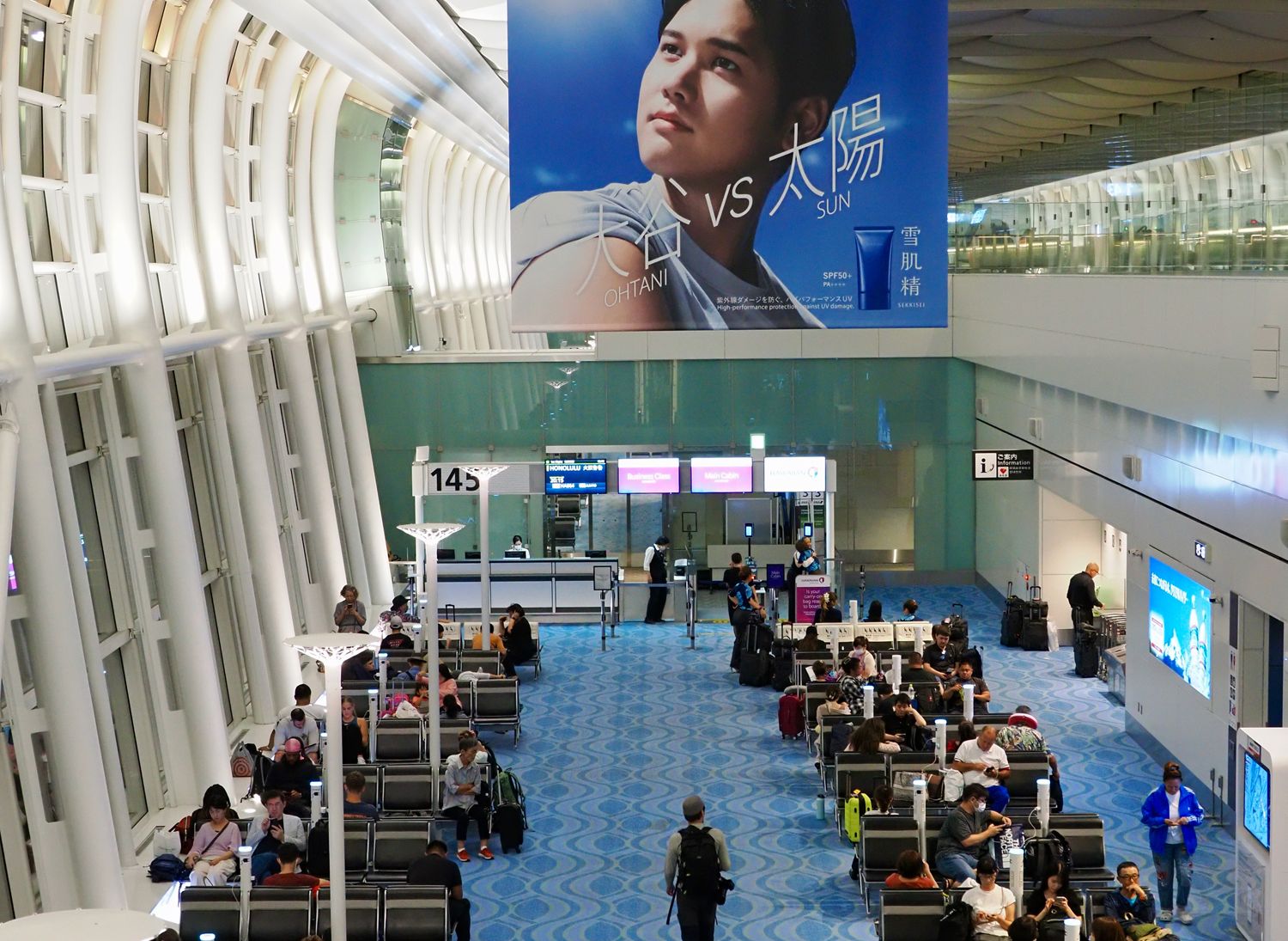 エスカレータを降りたら「オオタニサン」のジャンボポスターが出迎えます。窓ガラスの向こうに搭乗する機体も見えました。