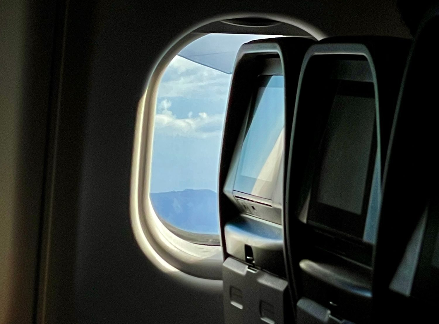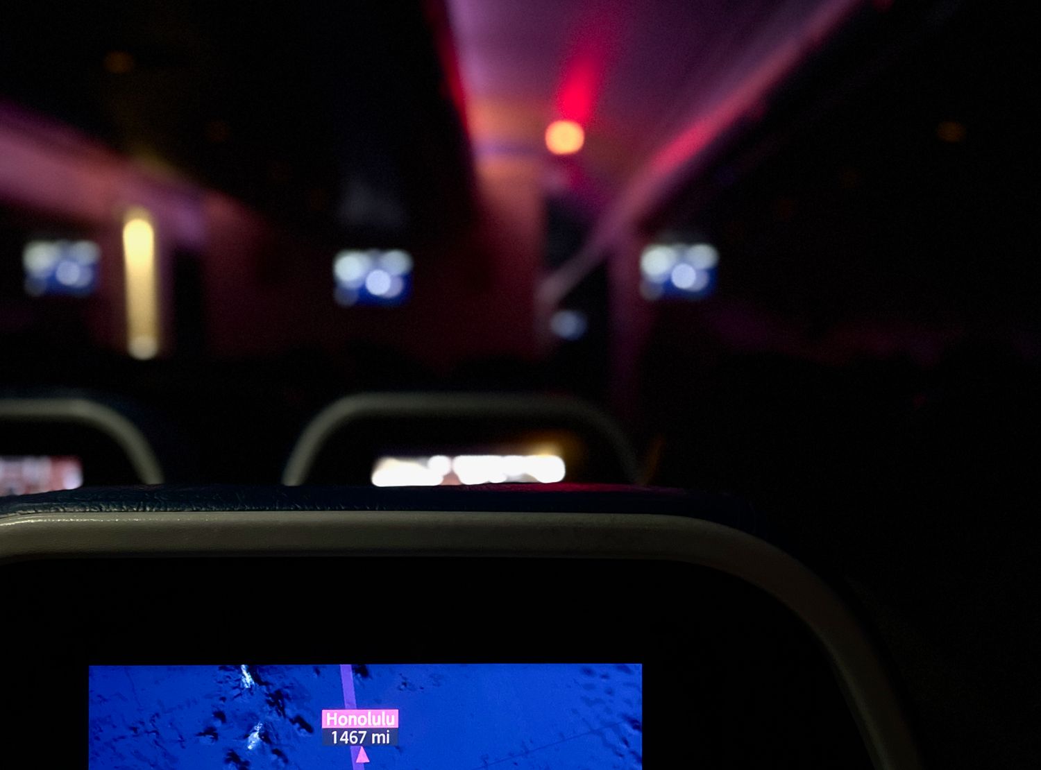 真ん中4列の右2席。内側を小柄なカミさん、通路側はワタクシが。ANAのホヌ(A380)に比べちゃうと、かなり狭く感じます。ほぼ定刻にテイクオフ。一路、ホノルルに。