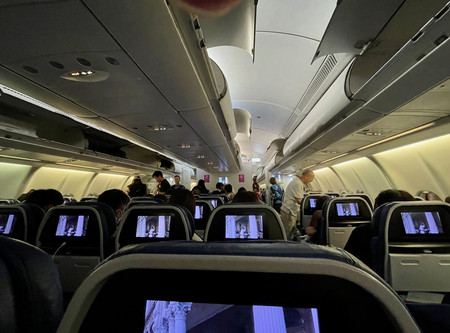 機首から乗り込み、奥へ奥へ。ANAみたいに横にはなれない、毎度のエコノミーシートです。背もたれ背面に比較的大きなモニター。HAWAIIANは無料のアイマスクとエアプラグ(耳栓)が茶封筒に入って配られます。うっかりヘッドホンをもらうのを忘れて、後でもらう事に。
