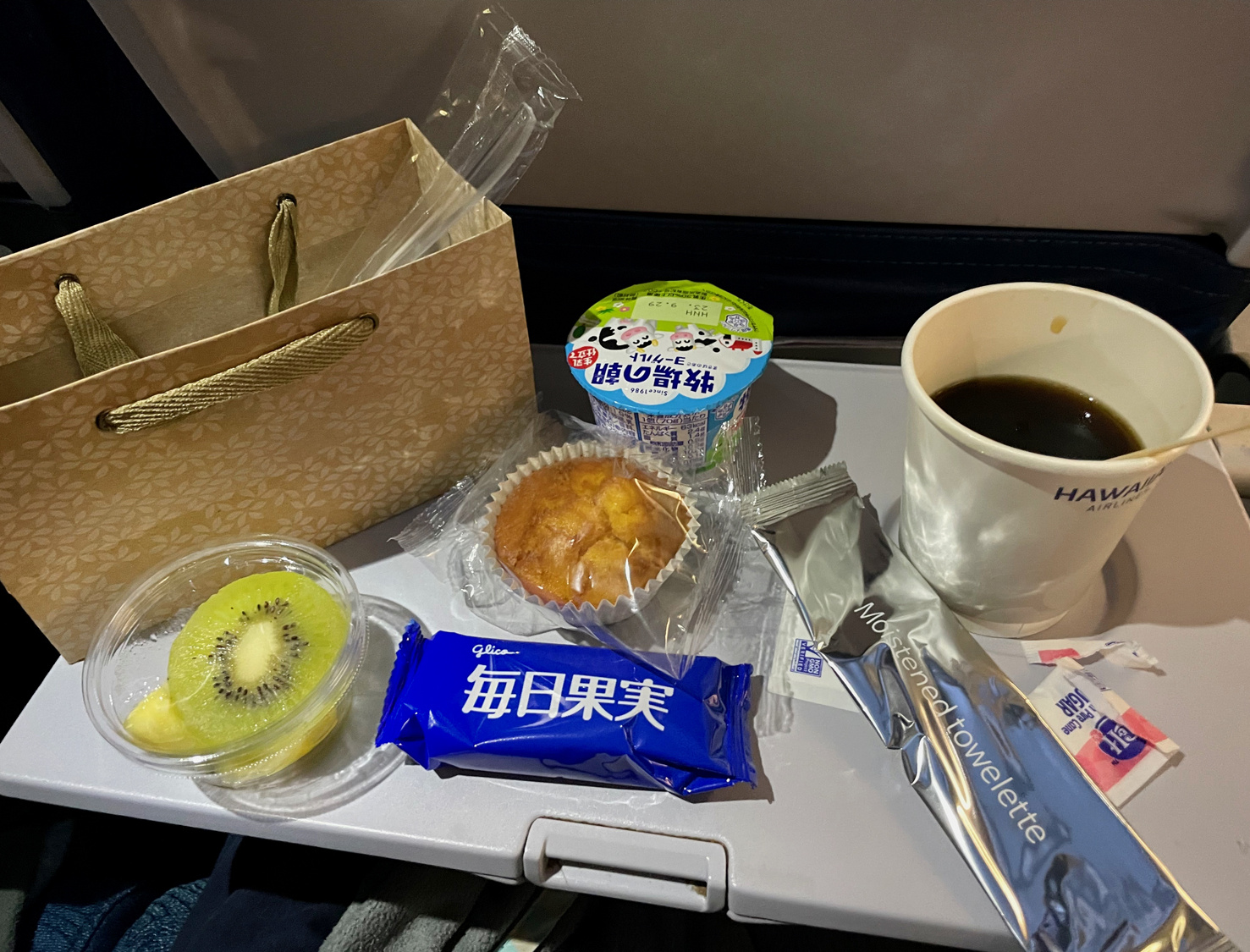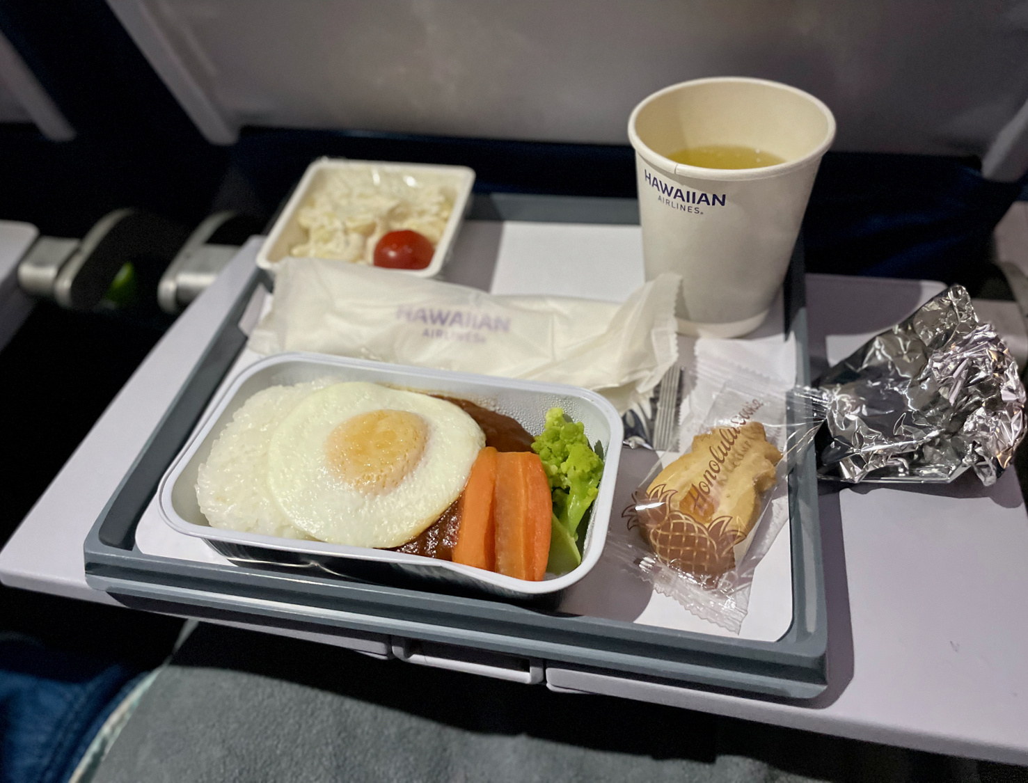 それにね、日本時間の深夜2時に食事は要らんですよね。ちなみにロコモコでした。到着2時間ほど前に軽食も配られます。まあ、ごくごく普通。
