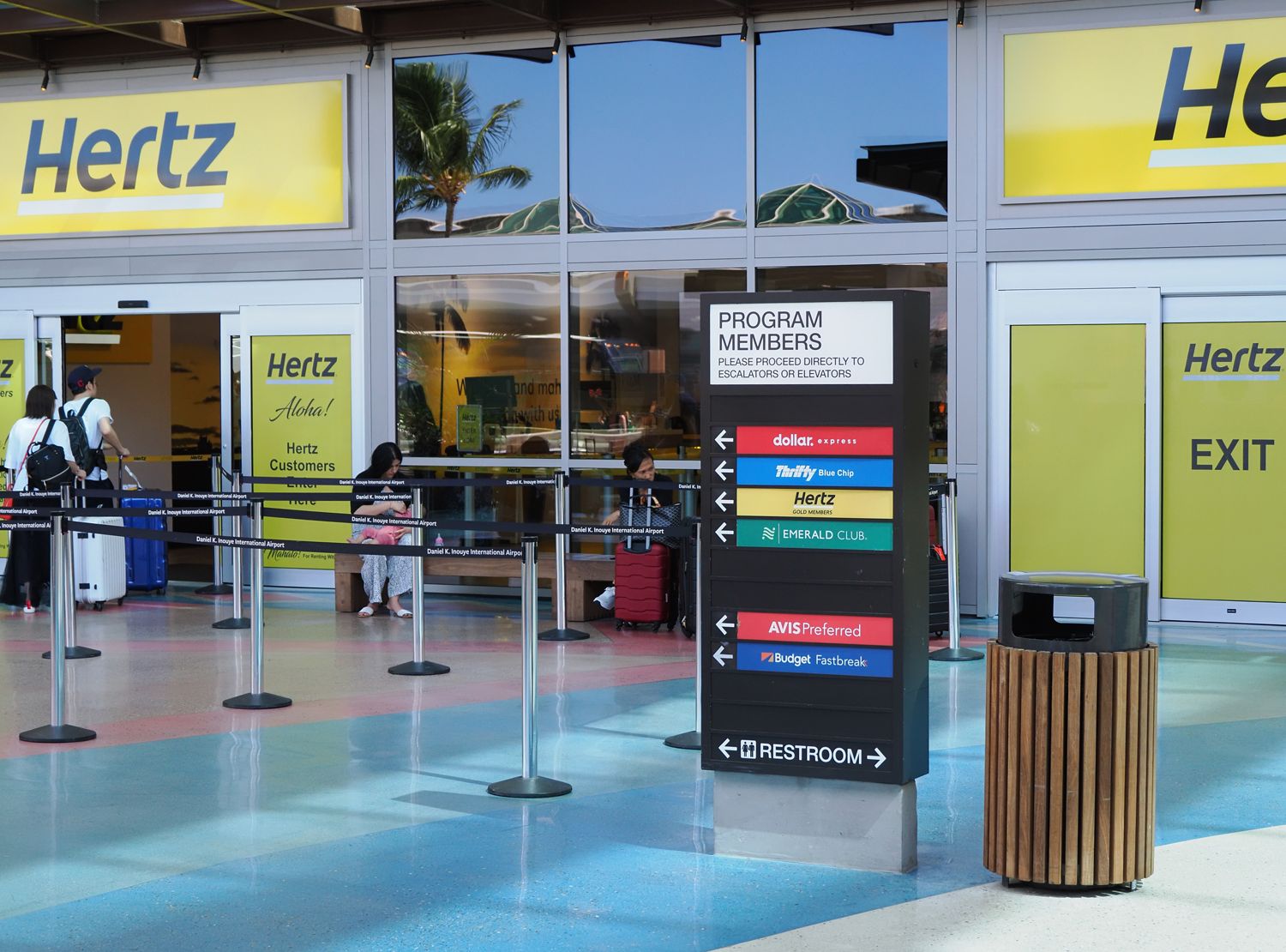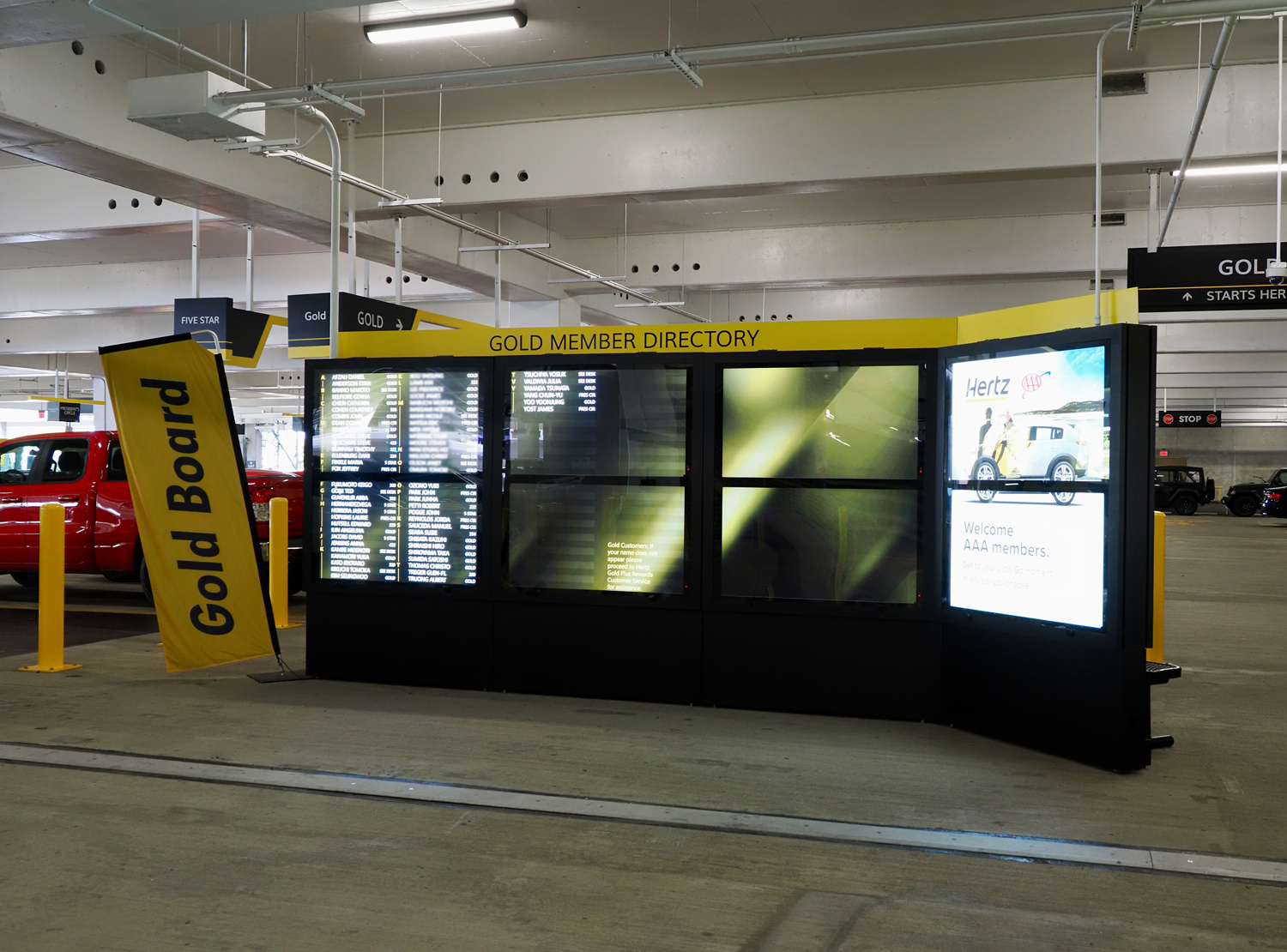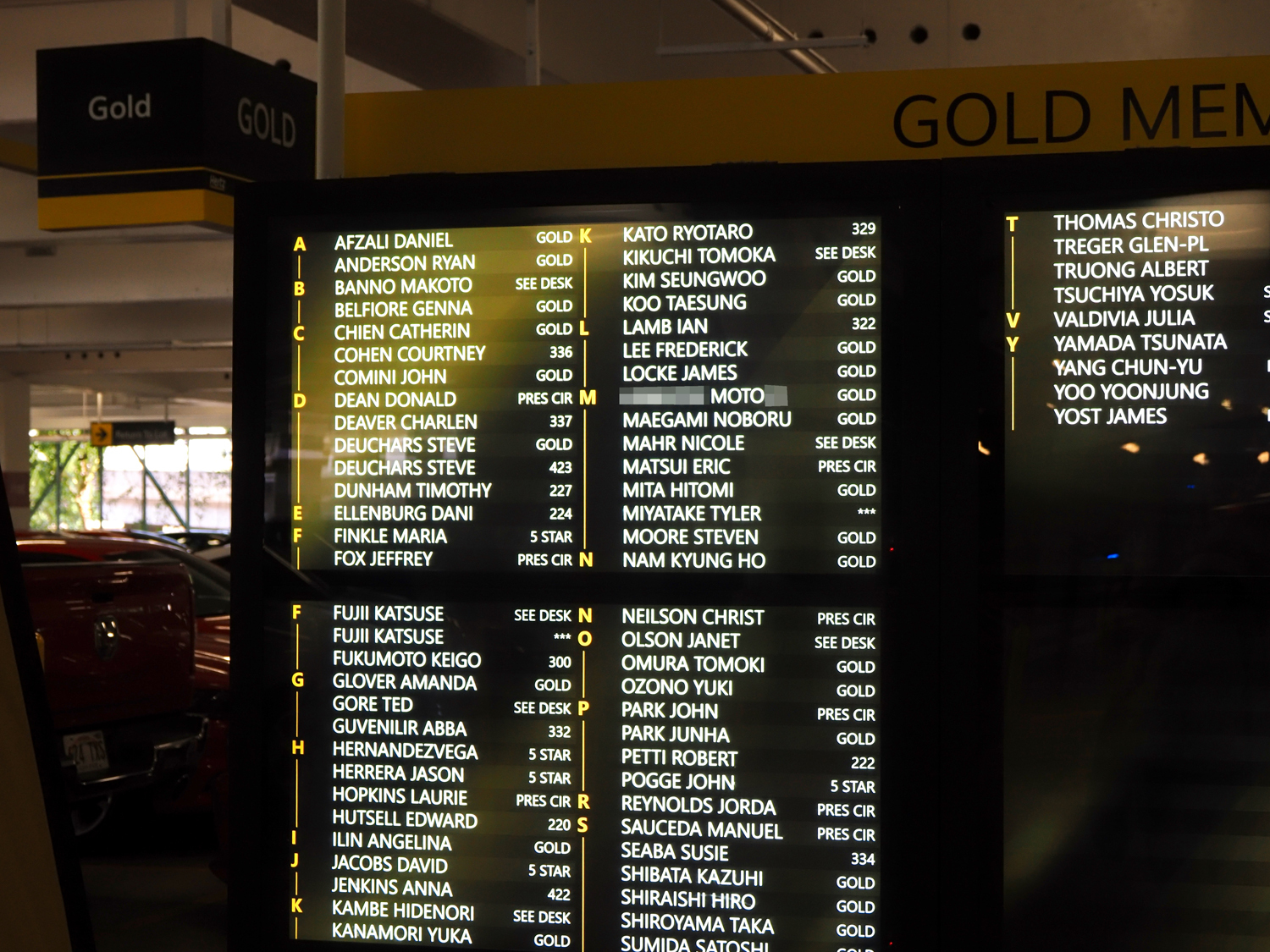 広くなっているエリアを通過して、今度は奥に向かって進みます。少し遠くに「Hertz GOLD MEMBERS」の黄色い看板のブースが見えたら、そこです。オフィスの横には、大きな電光掲示板「GOLDMEMBER DIRECTORY」があり、本日車を借りるメンバーの名前が表示されているんです。そこにはワタクシの名前も。
