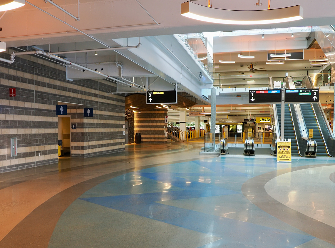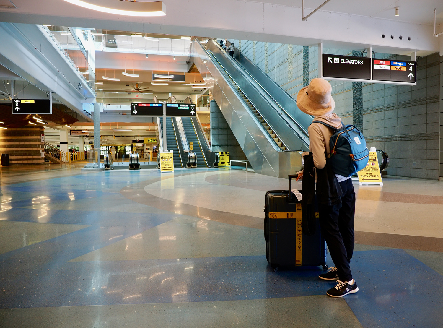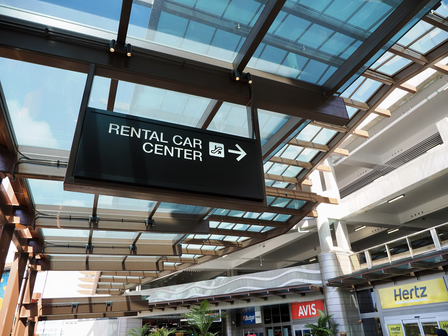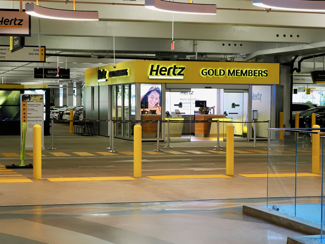 5分ほどスーツケースを引きずった後、歩道橋で反対側に渡ると「CONRAC:Consolidated Rental Car Facility」のビル。エスカレータで2階に上がると、レンタカーオフィスが並んでいます。目の前にHertzがあるんですが、実はここじゃないのは予習済み。そのまま前を通過して、左手奥に進みます。