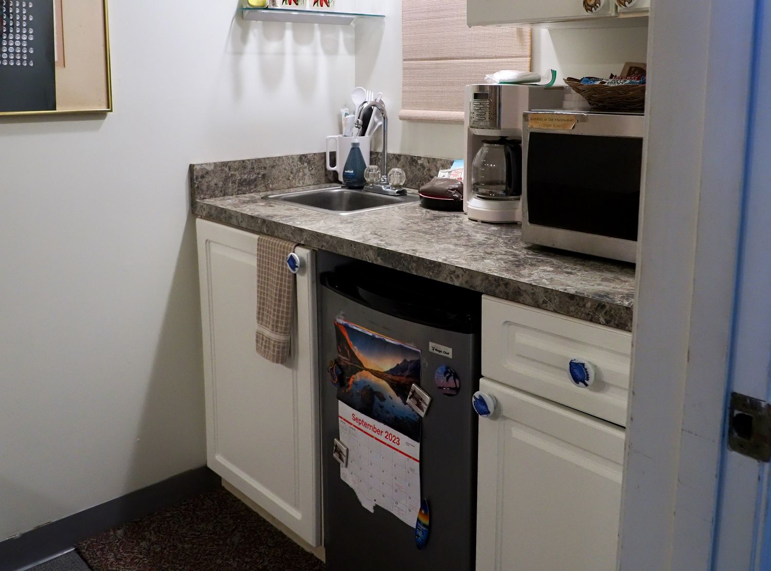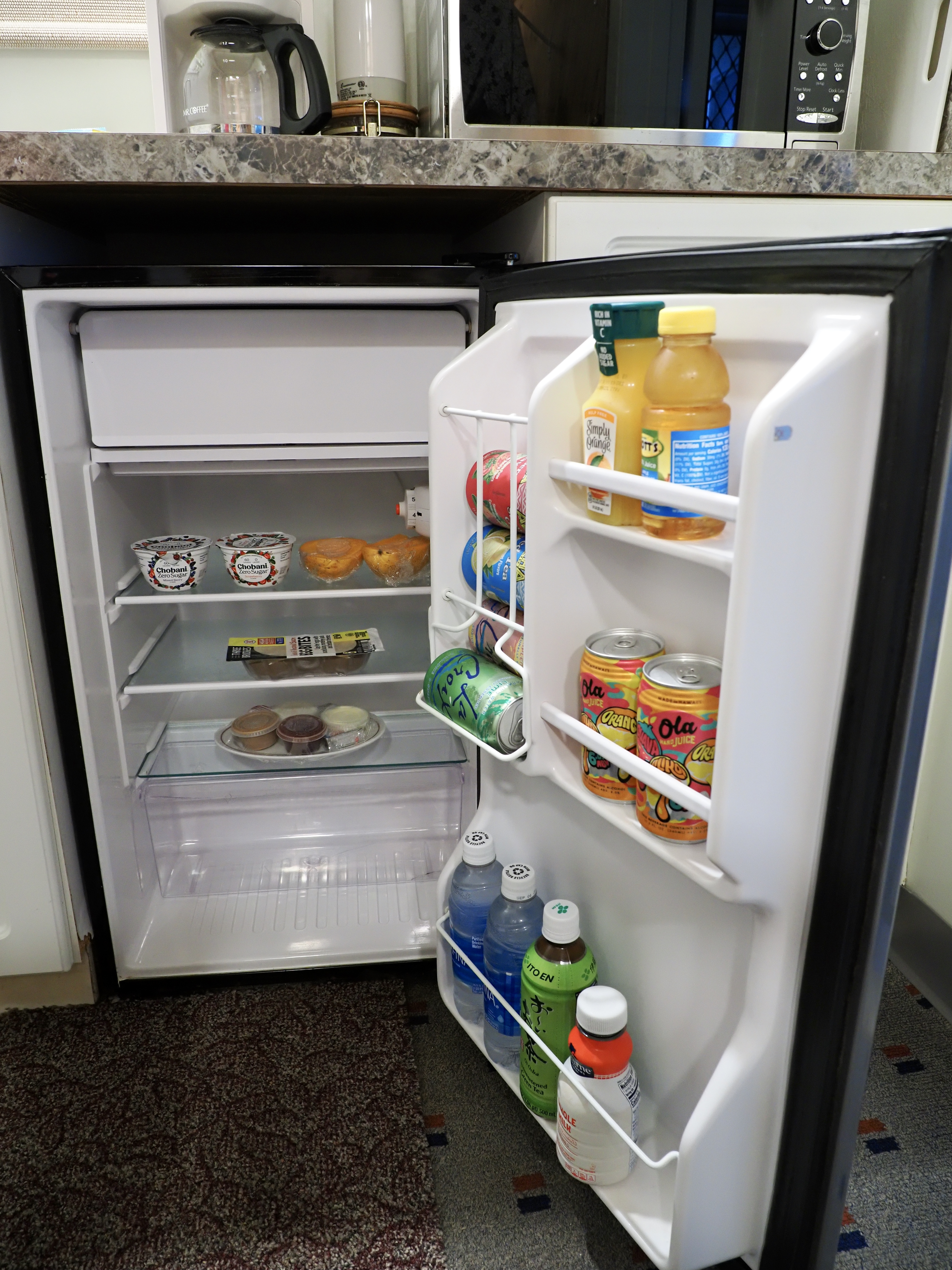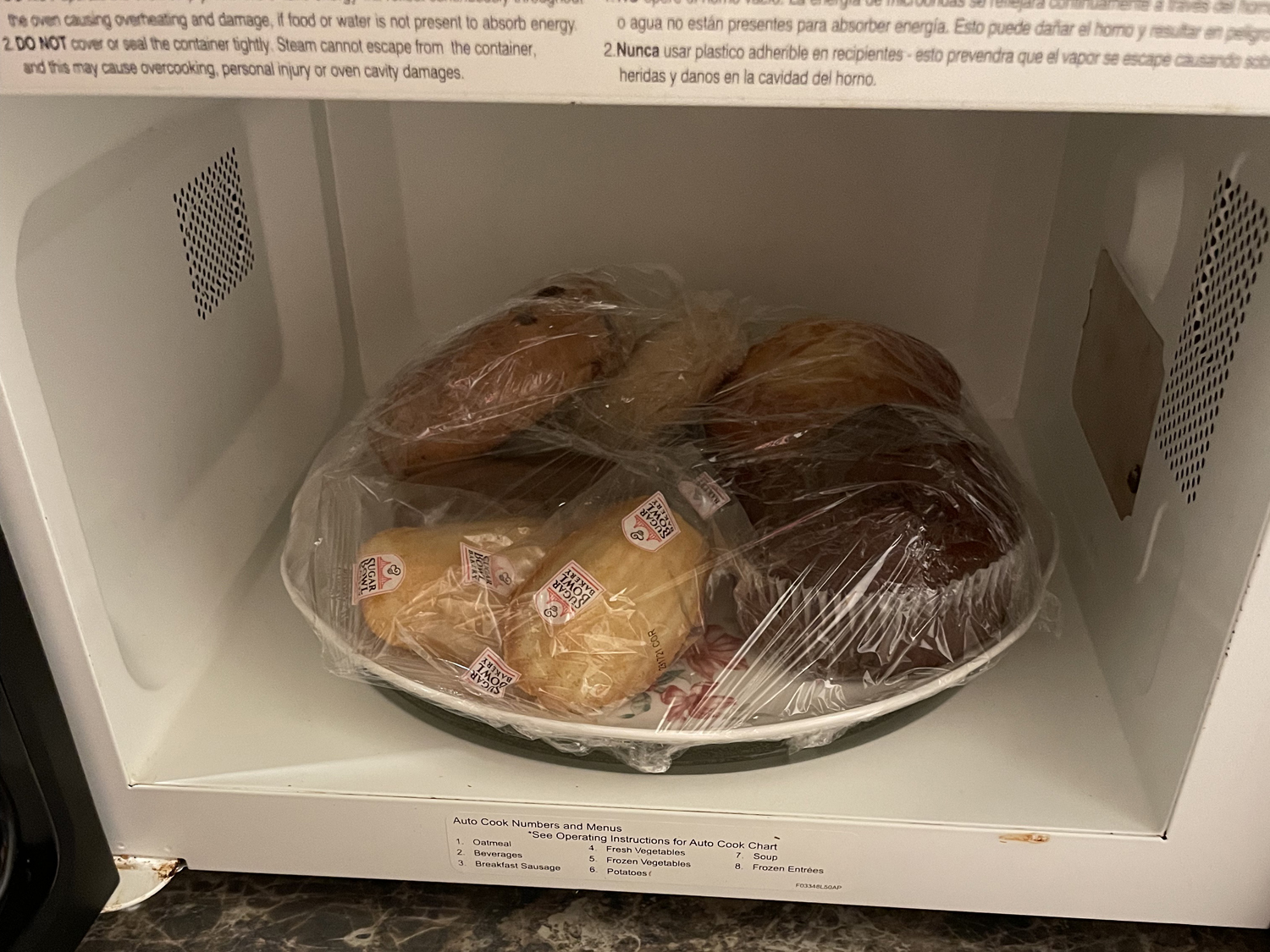 簡単なキッチンもあるのですが料理はしないでしょう。コーヒーを入れる位かな。電子レンジもあるので開けて見ると、そこに皿にラップが掛けられたパンが入ってました。なんで?