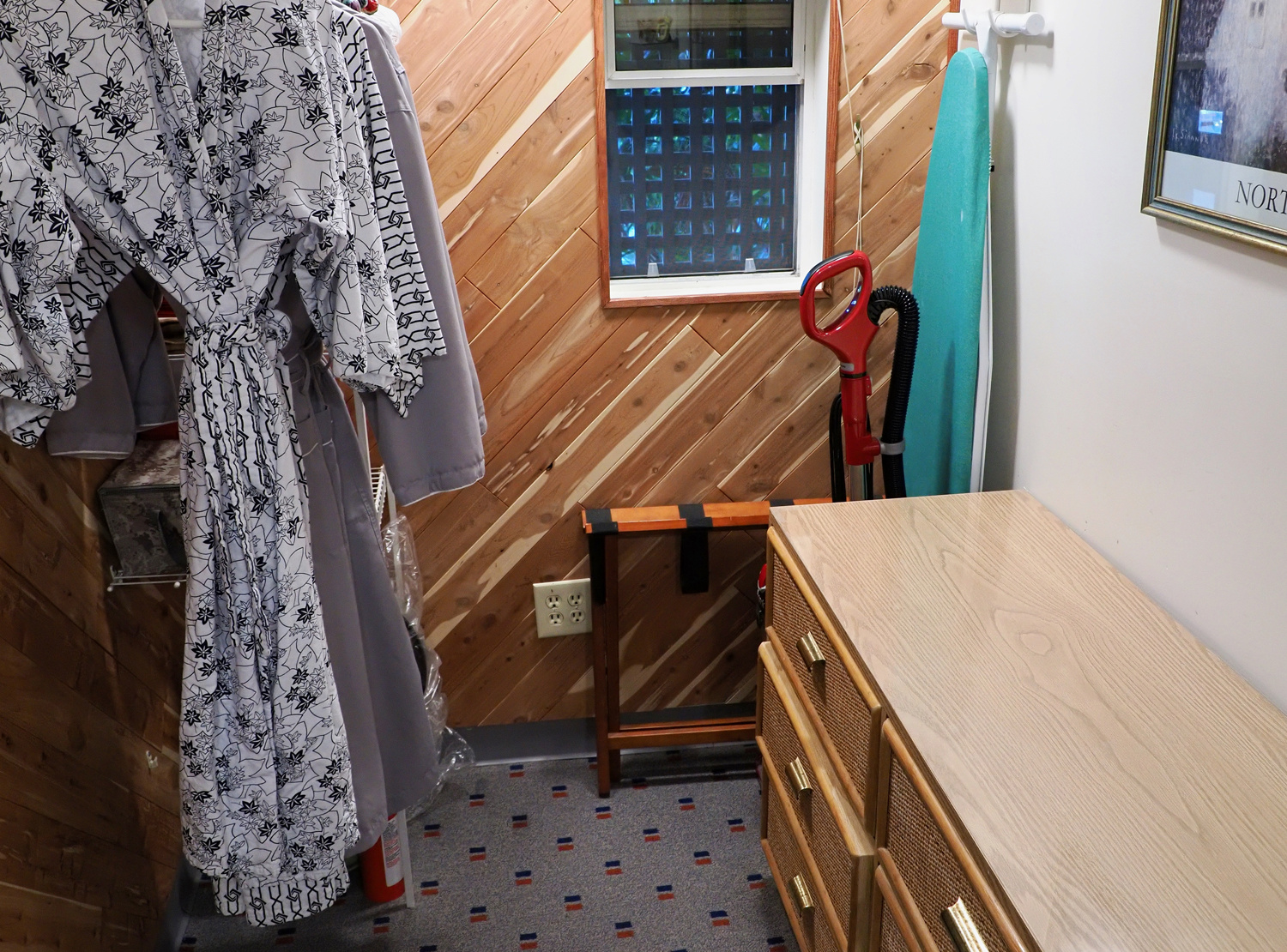 奥に入って照明のスイッチを入れると、アメリカTVドラマに出てくる様な納戸。雑多にモノがおいてあります。その奥に、乾燥機と洗濯機が。