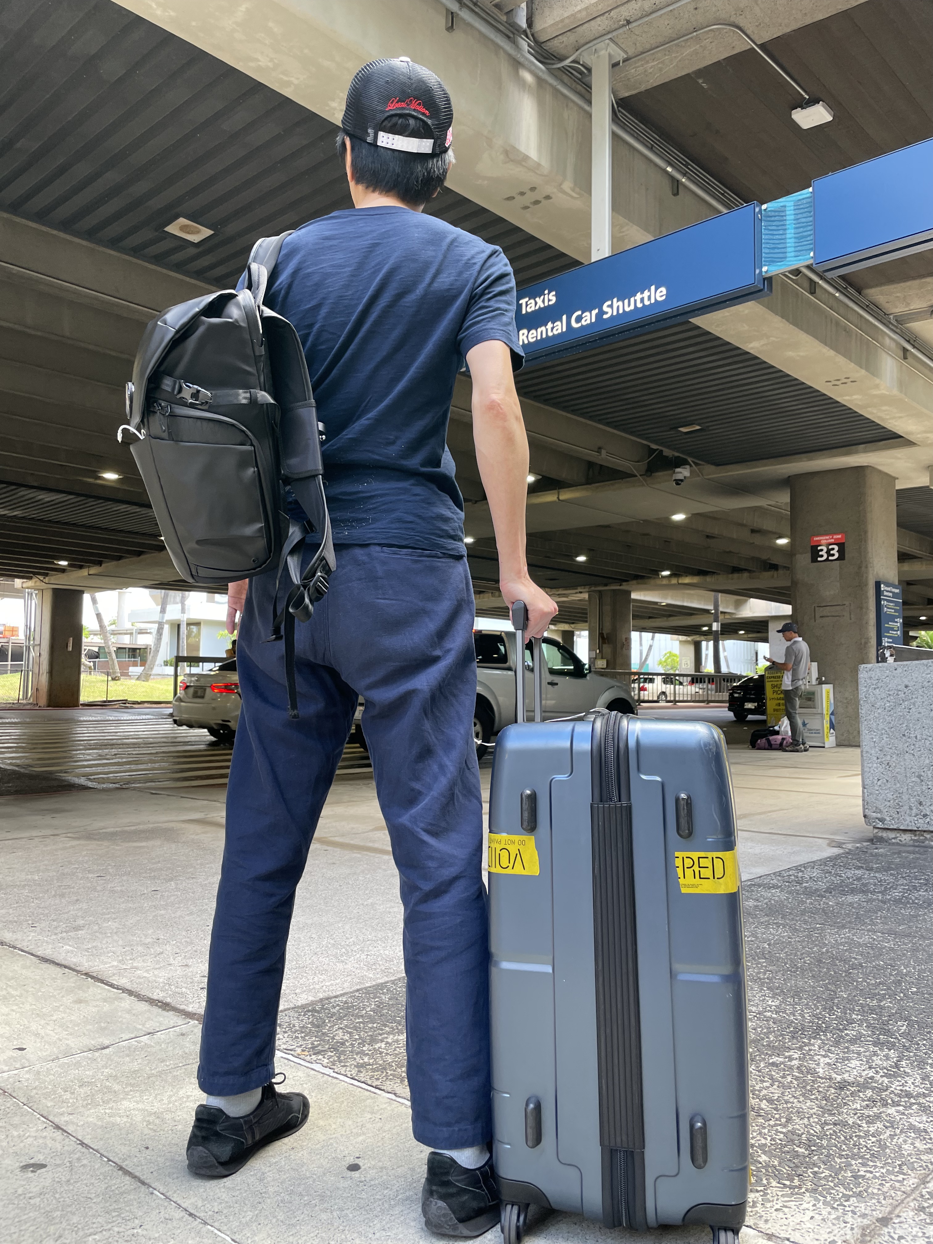 ソフトバンクの「アメリカ放題」を有効にするとT-mobileの電波をもう掴んでいました。オアフの空港は団体客も多いのでベルトコンベアにずっと荷物が回っているのを避けるためか、勝手に荷物が集められて置かれている事が多いんです。荷物が団体の荷物に混じっていたら本当に探すのが大変。なので目立つシールとか目印が必要なんです。AirTagをiPhoneから探すと暫くして認識、距離と方向が。指示に従って歩いて行くと、自分のスーツケースが目に入りました。案の定、数個のスーツケースの中にウチのも混じって置かれていました。AirTag、凄いぞ。スムースに荷物は見つかったので、カミさんをトイレに行かせた後、税関をクリア。個人出口に。