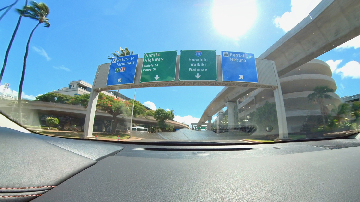 慣れない左ハンドルですから、ソロリソロリと車を進めて、いよいよ外に向かう車路に。反時計回りのループを降りて行くと、いよいよ空港周辺の道路へ。Nimitzを使い、ワイキキ方面に行きたいので、左から2番目の道に。車線がクロスしているので、周りに注意して合流です。