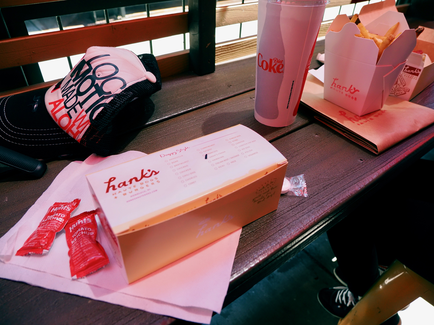 出来上がったドッグをもって外のパラソルエリアへ。パラソルが真っ赤なので色被りしちゃって変な色の写真に。ハトが寄ってくるので注意。到着日の昼には丁度良い軽さ。ササっと腹ごしらえを完了します。