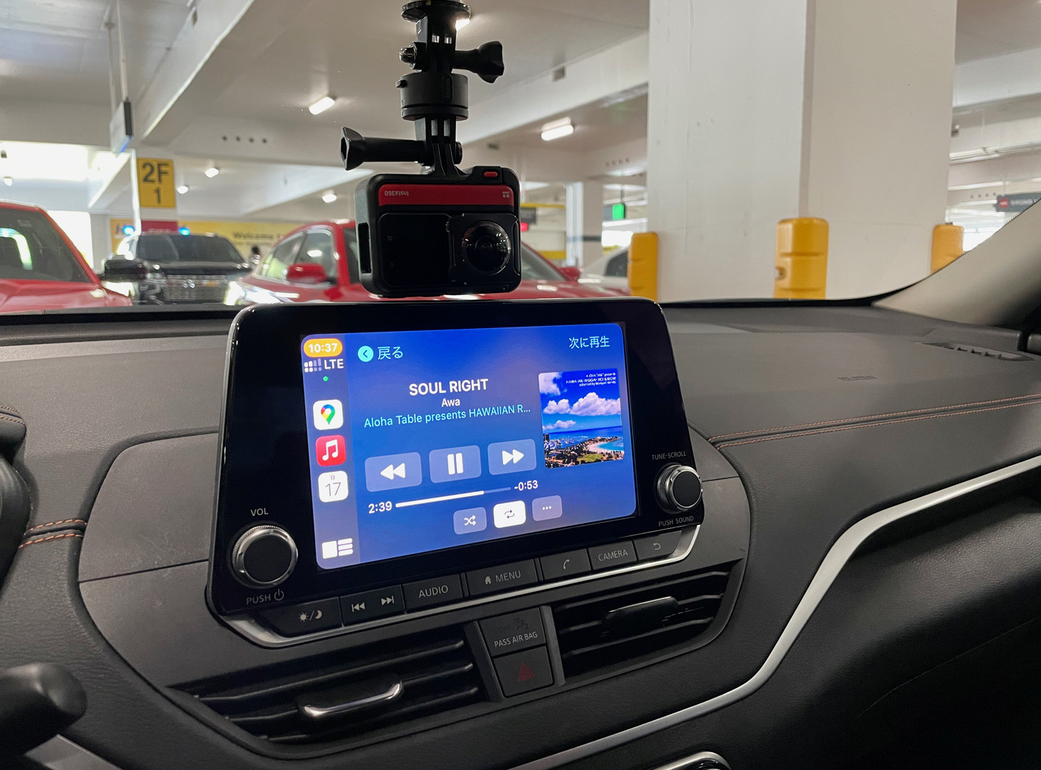 とりあえず黒いNISSANに決定。トランクを開けてスーツケースを乗せ、車の操作をチェック。iPhoneを繋ぐとAppleCarPlayもできるのでGoogleMapも使えそうです。