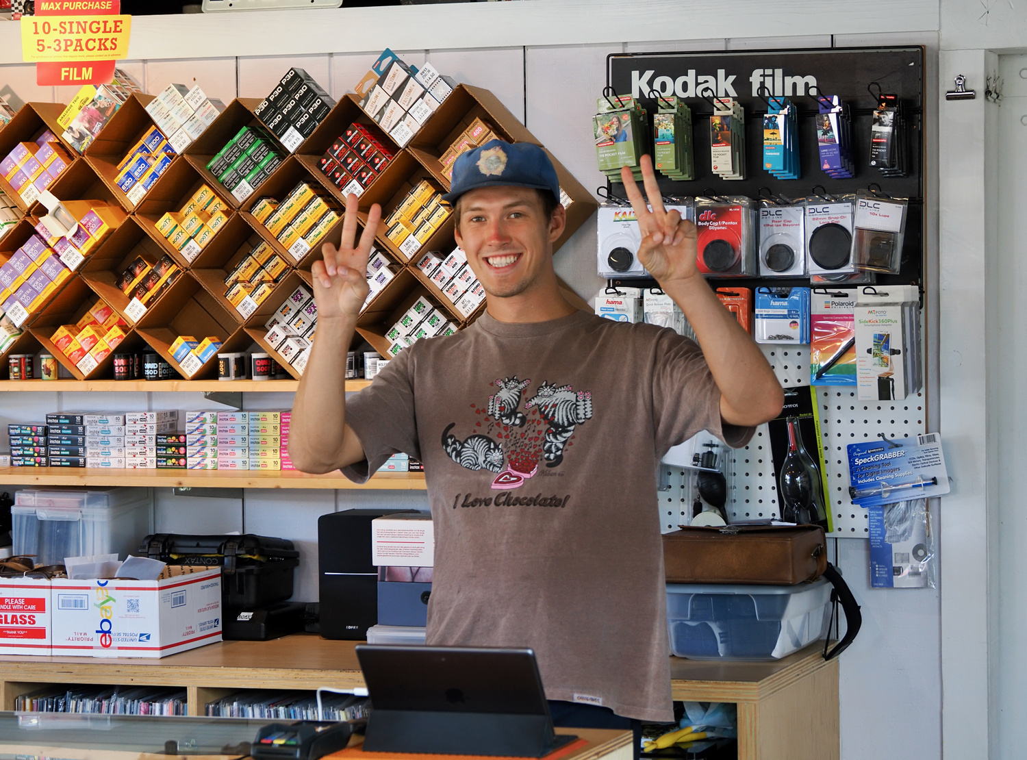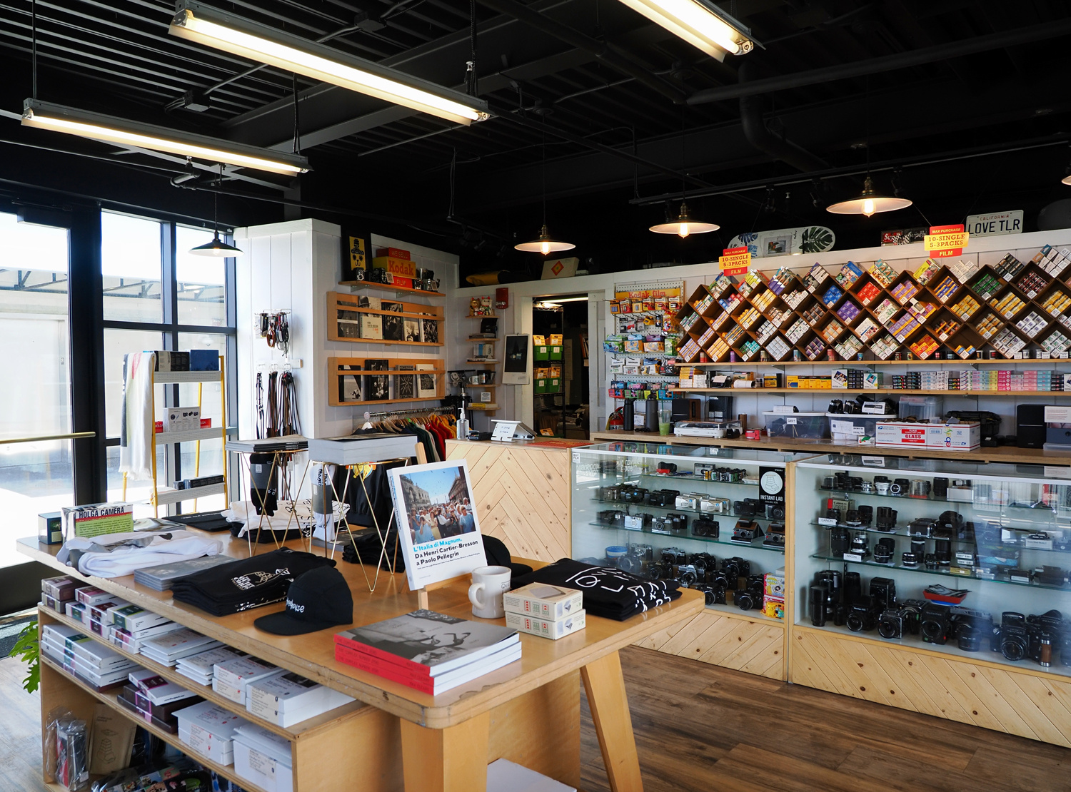 実は狙っていたTシャツがあったんですが、サイズが合わず残念。店員のにーちゃんと暫く使ってなかった英語で会話してみます。ショーケースの中にはフィルム時代のOM-1が飾ってあったりしました。