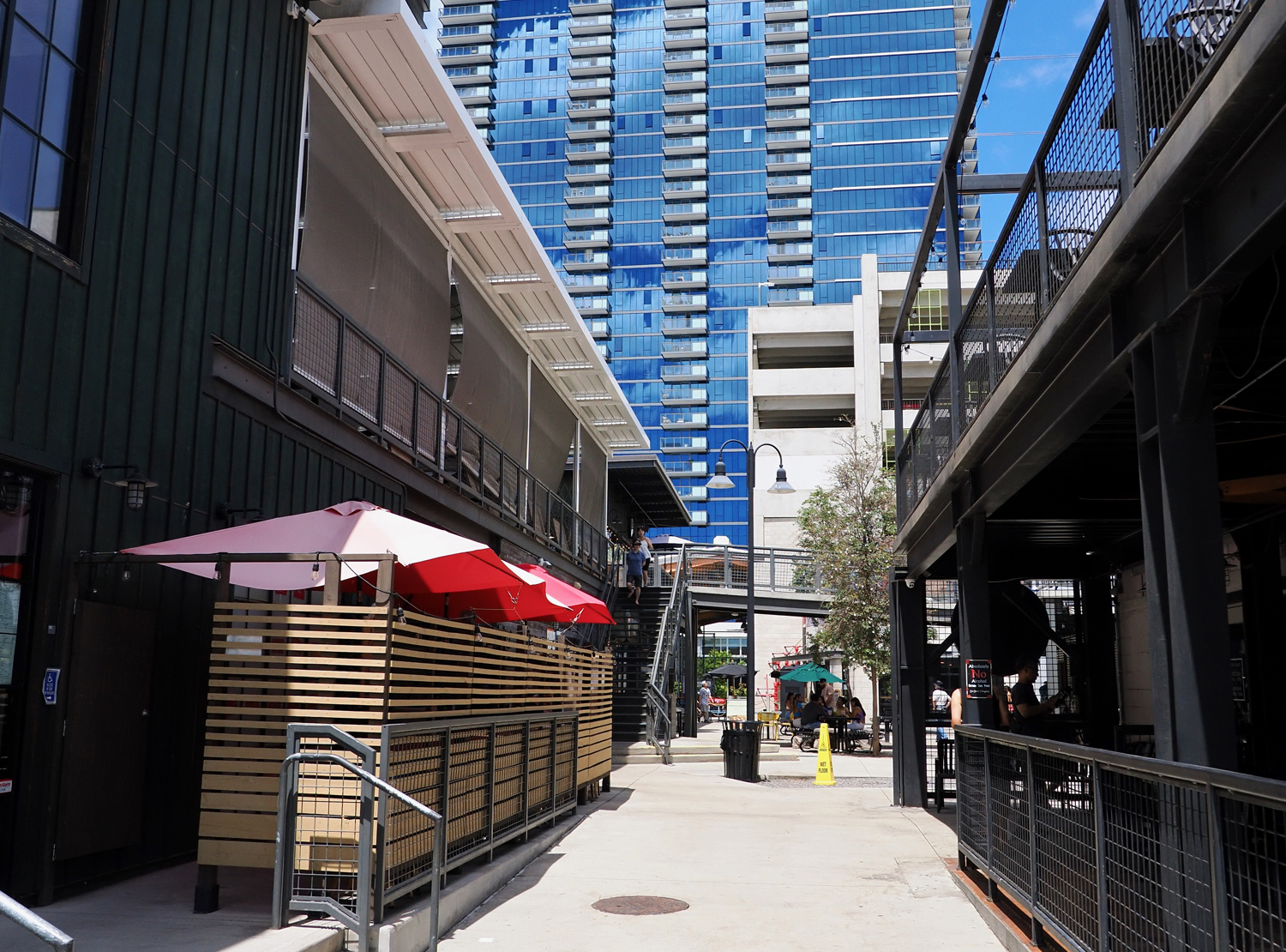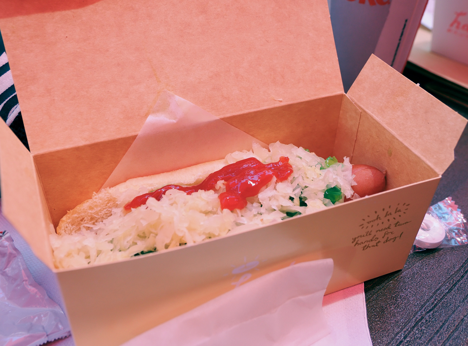 1階に降りて目的のホットドッグ屋へ。SALTには色々なお店も入っていて、随分人気のスポットになっているみたい。人出もそれなりにあります。ある意味、人出があるエリアの方が安心とも言えます(カカオコは通り1本で倉庫街になるので、そんなに安全なエリアではないのです)。11時を過ぎているのでお店は開いていました。物価高の中、ドッグの値段もそれほど変わっていない様子。ドリンクと合わせて注文します。テキトーな英語ならまだなんとか注文できるレベルですw。店内にカウンターと椅子があったのが無くなって外にパラソルとイートイン・コーナーができていました。