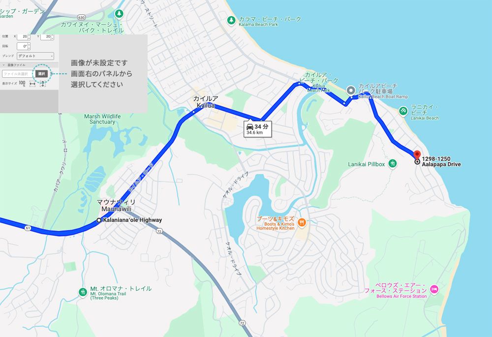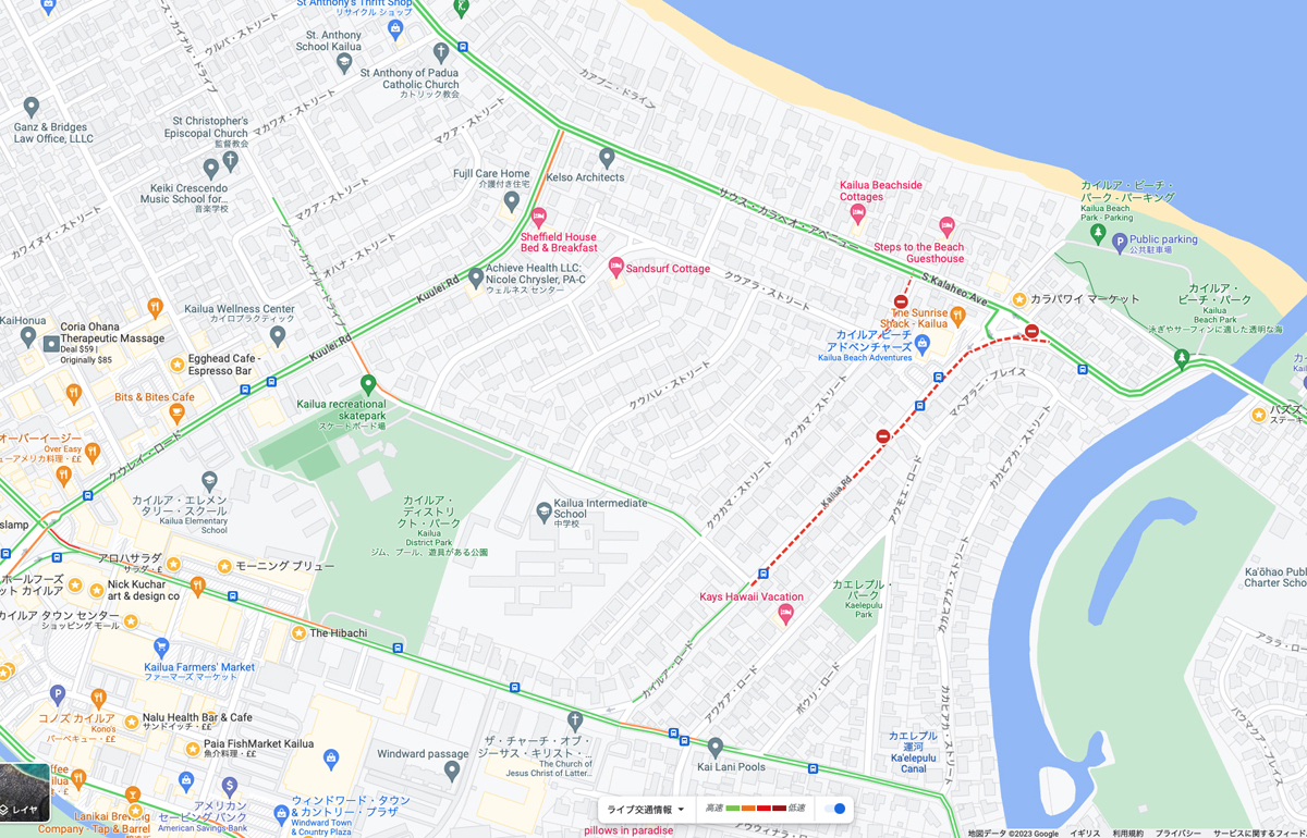 Kailua RD.が工事中ってカイルア&ラニカイ地区に行くなって言ってる様なモノです。事前に調べてて愕然としました。数日前にも事件があったみたいで状況が分かりません(後でカイルア地区からこっちには来れるという事が判明。片側が閉鎖みたいです)カイルア中心地区を抜けて、突き当たりのS.Kalaheo Ave.まで直進。そして右折して真っ直ぐカイルア・ビーチパーク方面へ。カラパワイ・マーケットの緑のお店が見えて来ますと、サークル状の道の横を通ってカイルア・ビーチ沿いの道へ。後はラニカイ方面に向かう形。