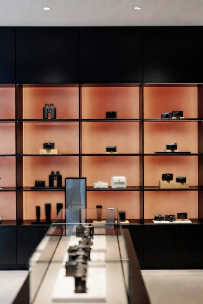 赤い棚に並ぶカメラ。遠目に赤いバッチが付いている様にも見える。